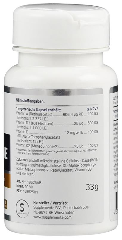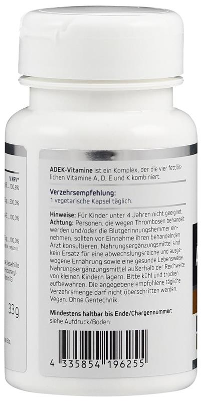 ADEK vitamins is a complex that combines the four fat-soluble vitamins A, D, E and K. Fat-soluble vitamins perform many different tasks in the human body. For example, vitamin A is important for skin and eyesight, vitamin D for muscle function, vitamin E is an antioxidant and vitamin K plays a role in blood clotting, among other things.