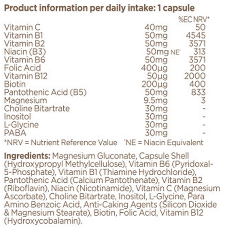 Optimum support – B vitamins help release energy from food, helping to reduce tiredness, as well as supporting mental health & performance, and hormone balance