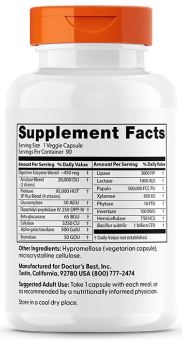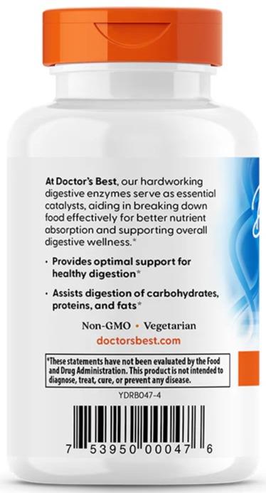 Doctor's Best Digestive Enzymes is a uniquely formulated, full-spectrum high potency digestive enzyme blend created to complement and support the body's own digestive capacities. Each capsule provides the body with enzymes designed to optimally aid the digestion of fats, proteins and carbohydrates present in cooked and raw food. The formula supplies the added support of alpha-galactosidase and beta-glucanase to break down vegetables, beans and grains, and enzymes such as glucoamylase and invertase to assist with the digestion of sugars. In addition, this complete formula contains friendly bacteria to uniquely promote optimal intestinal health.