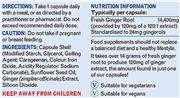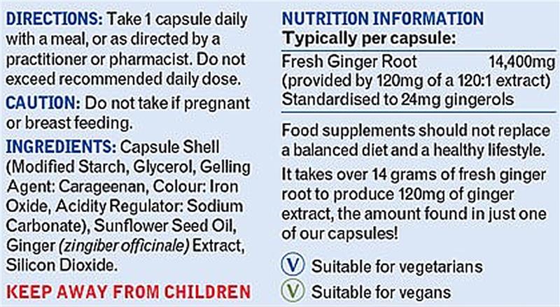 It takes over 14 grams of fresh ginger root to produce the amount of concentrated extract found in each of these capsules! Each capsule provides 24mg of gingerols, which are volatile compounds that are easily lost if ginger is cooked, dried or crystallised. Very few supplements provide this level of gingerols, and in fact many do not even declare a level on the label.