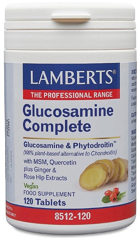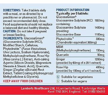 Glucosamine Complete combines GlucosaGreen® with Phytodroitin™ - a plant-origin alternative to chondroitin, manufactured from a blend of seaweed extracts. Lamberts Glucosamine Complete provides 330mg of Phytodroitin™ (per 3 tablets), equivalent to 300mg of pure chondroitin. With a focus on relevant botanicals, the powerful bioflavonoid, quercetin, has been included at a potent 50mg, plus 1200mg of ginger and 400mg of rose hips. Our formula is complete by the addition of 150mg of MSM.