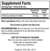 Supplies 75 mcg of iodine (as potassium iodide) per drop. Iodine is an essential trace mineral, and is vital to healthy thyroid function. Vegetarians may be at increased risk of iodine deficiency.
