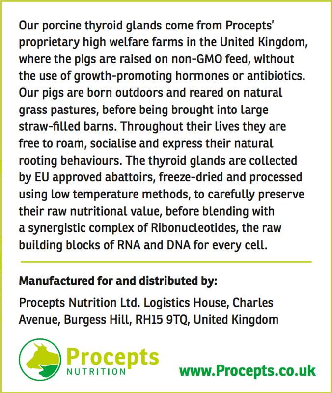 The thyroid glands are collected by EU approved abattoirs, freeze-dried and processed using low temperature methods, to carefully preserve their raw nutritional value, before blending with a synergistic complex of Ribonucleotides, the raw building blocks of RNA and DNA for every cell.
