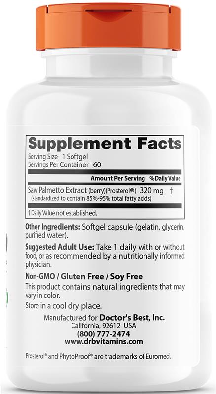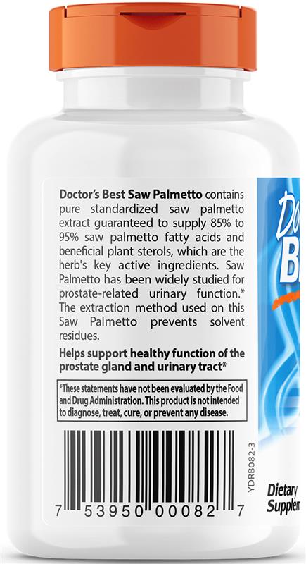 Doctor's Best Saw Palmetto contains pure standardized saw palmetto extract guaranteed to supply 85% to 95% saw palmetto fatty acids and beneficial plant sterols, which are the herb's key active ingredients. Saw Palmetto has been widely studied for prostate-related urinary function. The extraction method used on this Saw Palmetto prevents solvent residues.