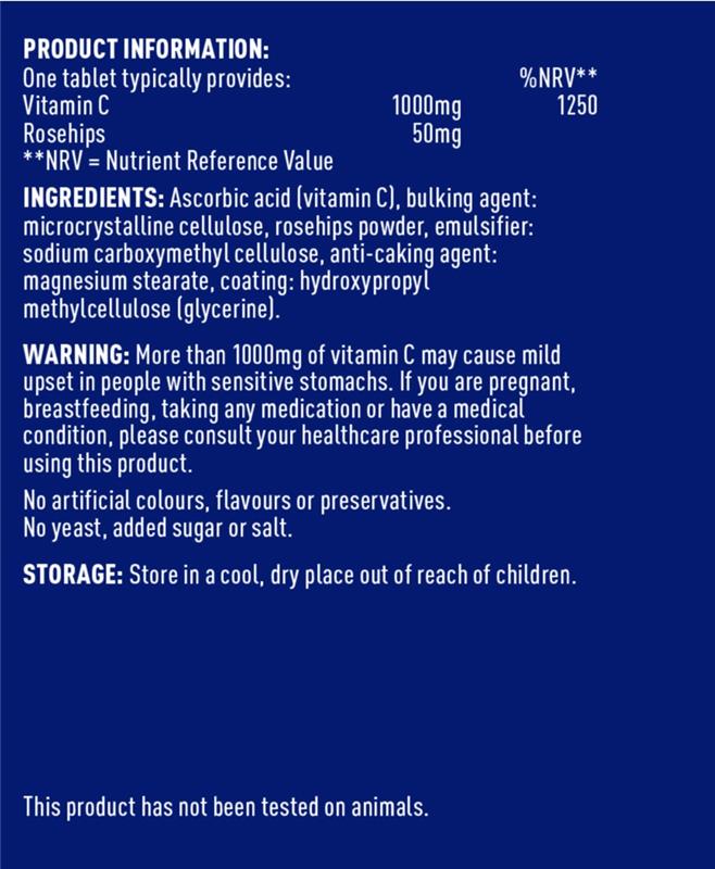 Each tablet provides 1000mg vitamin C combined with naturally powerful rosehip for improved benefits. This essential nutrient is a key requirement for immunity, the body’s production of collagen, cartilage, skin, joints, teeth and gums. It also contributes to energy production.